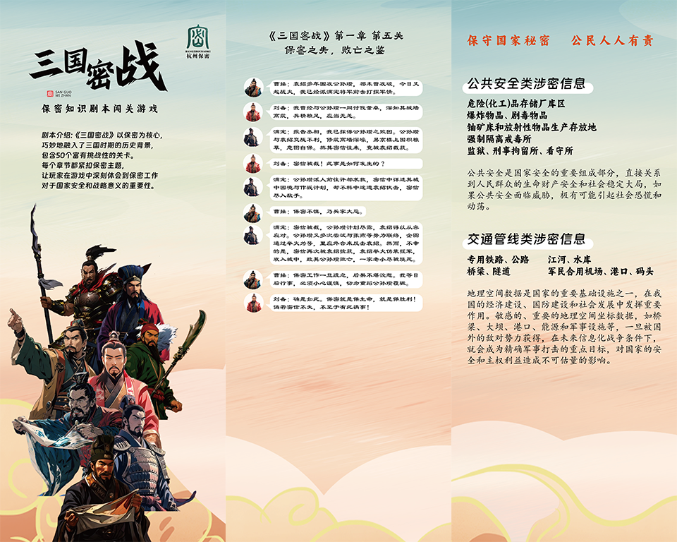 值得一提的是,2025年5月29日至6月2日,杭州法喜品牌设计有限公司携手杭州市国家保密局,携《三国密战》保密主题剧本游戏亮相第二十一届中国国际动漫节。活动期间,该游戏在杭州白马湖国际会展中心与全球参展者见面,借助动漫节“动漫+科技”的平台优势,通过现场展示、互动体验等形式,进一步扩大了保密安全教育的覆盖面与影响力,让保密知识以更年轻化、潮流化的方式走进大众视野。这一创新实践既契合本届动漫节“一起做‘国漫’天命人”的主题,也践行了“科技赋能保密宣教”的理念,成为动漫节上传递主流安全价值的特色亮点之一。