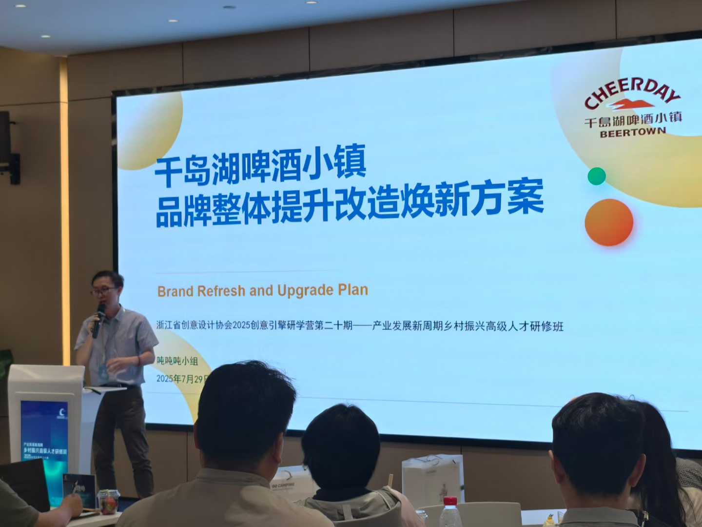 近日,由浙江省创意设计协会主办的2025 创意引擎研学营第二十期 —— 产业发展新周期乡村振兴高级人才研修班圆满落幕。杭州法喜品牌设计有限公司总经理冯宇担任组长的千岛湖啤酒小镇 “吨吨吨小组”,凭借《千岛湖啤酒小镇品牌整体提升改造焕新方案》,在全班提案评审中荣获第一名,获评优秀提案,以专业创意实力赋能乡村文旅振兴。