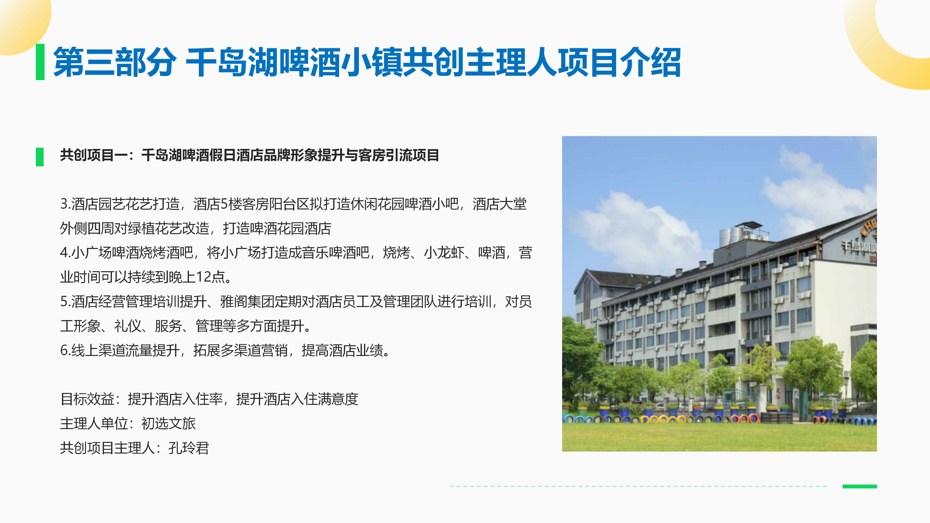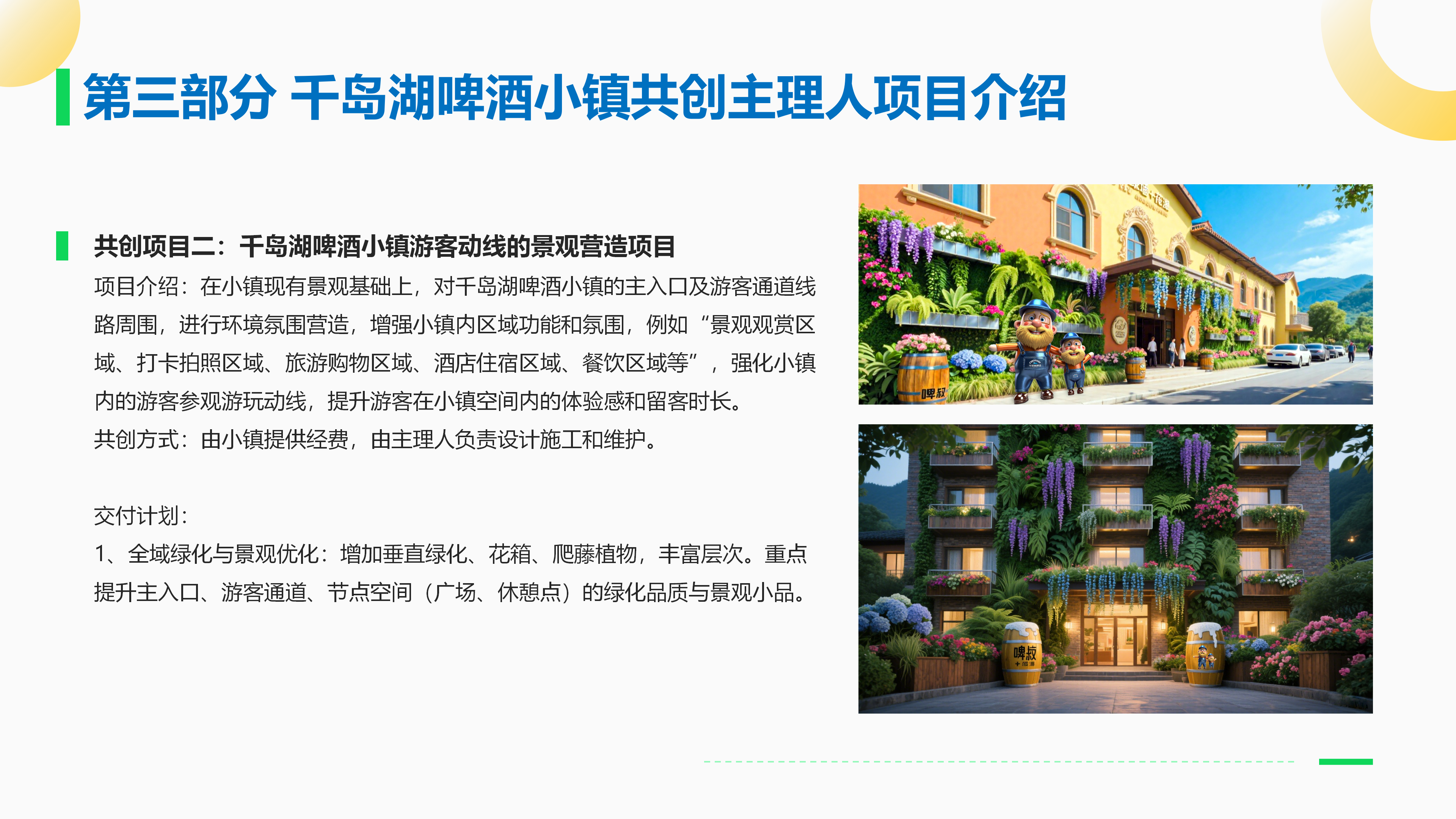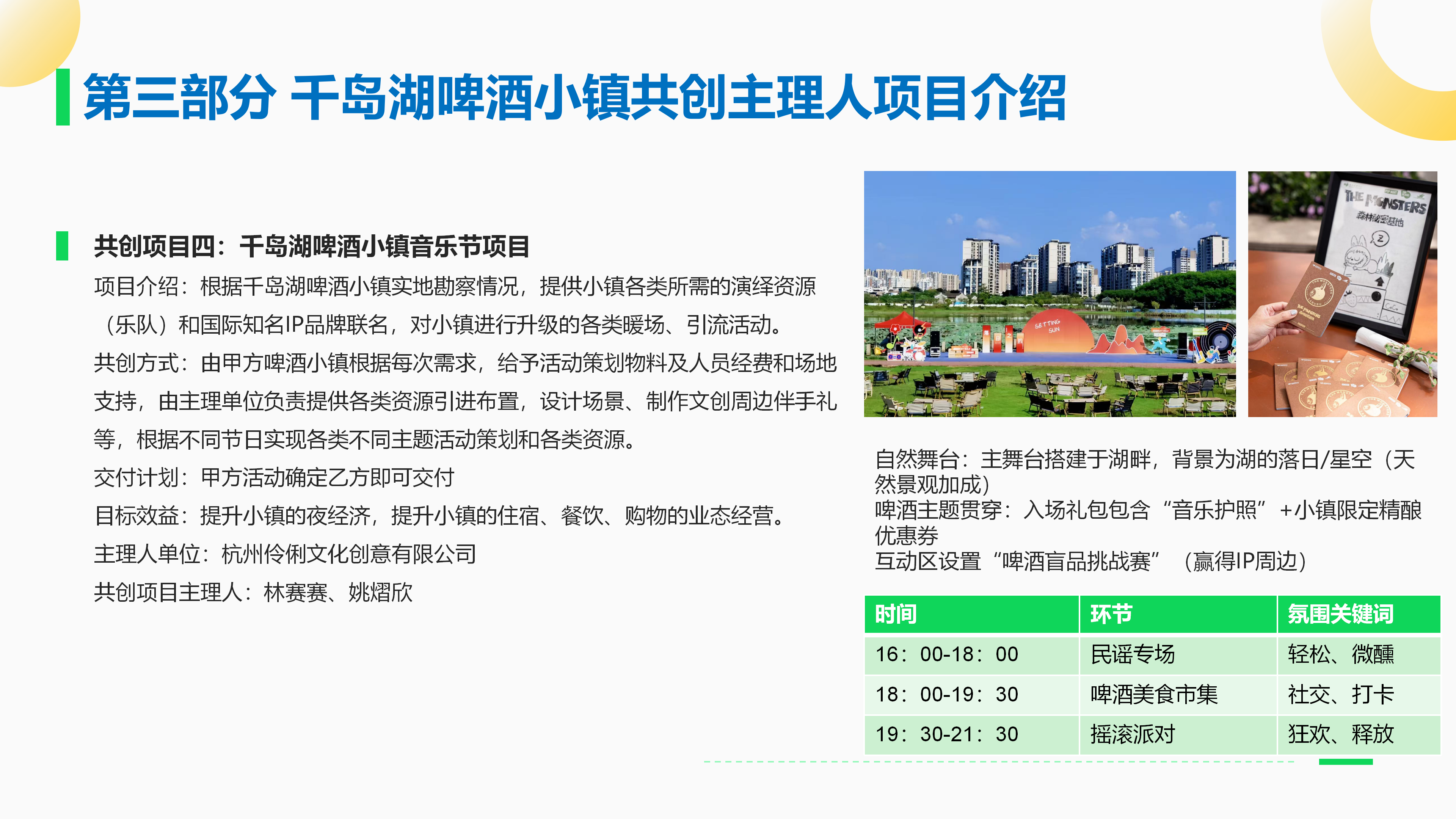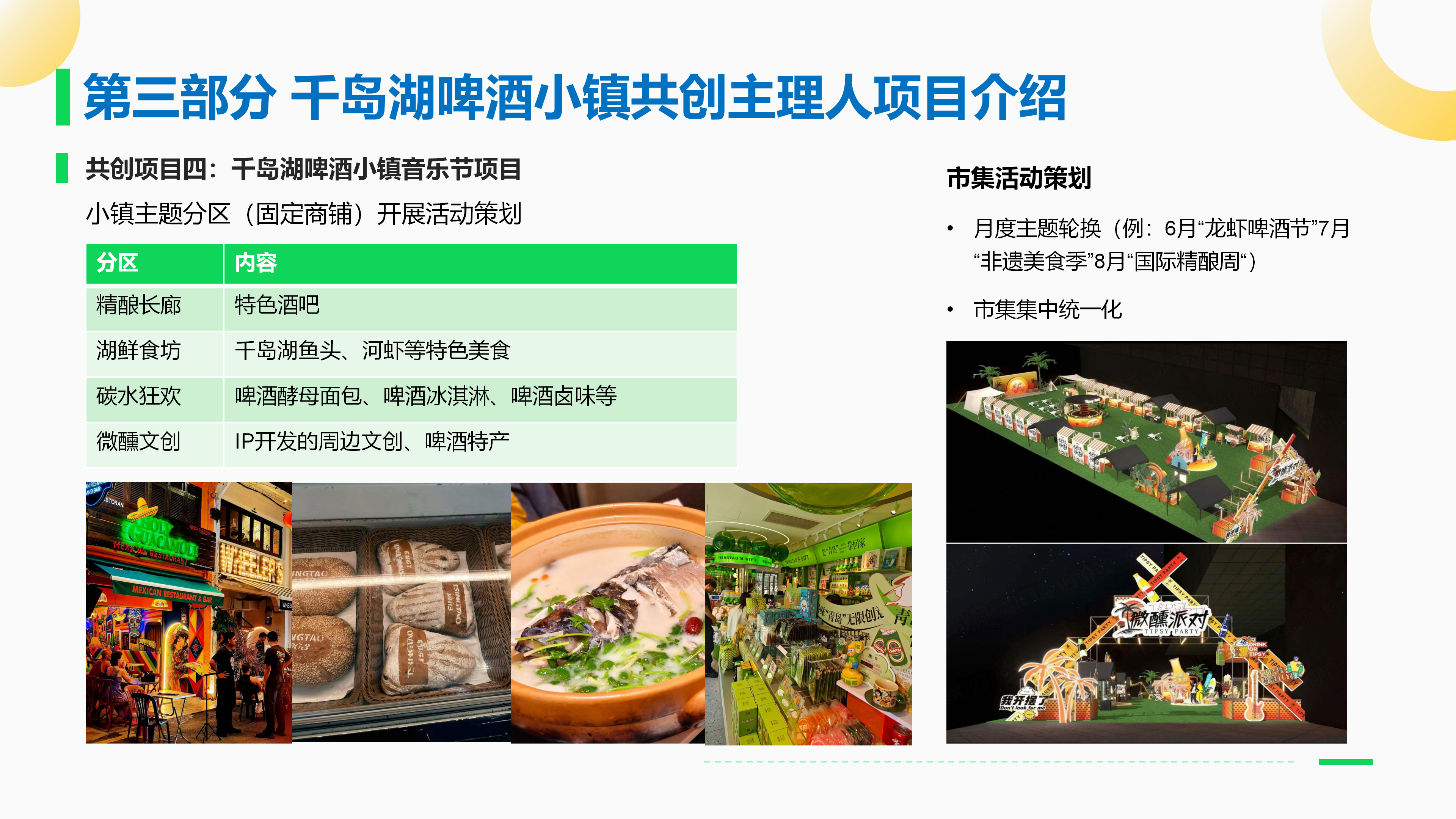 方案围绕定位失焦、业态离散、经营粗放、转化疲软四大核心问题,提出世界啤酒风情聚合地全新定位,打通 “文化定位 — 业态升级 — 动线优化 — 夜经济激活 —IP 共创 — 全域营销” 全链条,涵盖品牌焕新、国际啤酒文化体验、啤酒衍生餐饮、文创开发、社交场景打造、共创主理人计划等多项创新举措,预计全面落地后年新增直接收益可达2700 万 —3500 万元,有效破解 “节日火爆、日常冷清” 困境,提升过夜率与复购率,助力千岛湖啤酒小镇实现从观光打卡地向沉浸式文旅目的地升级。