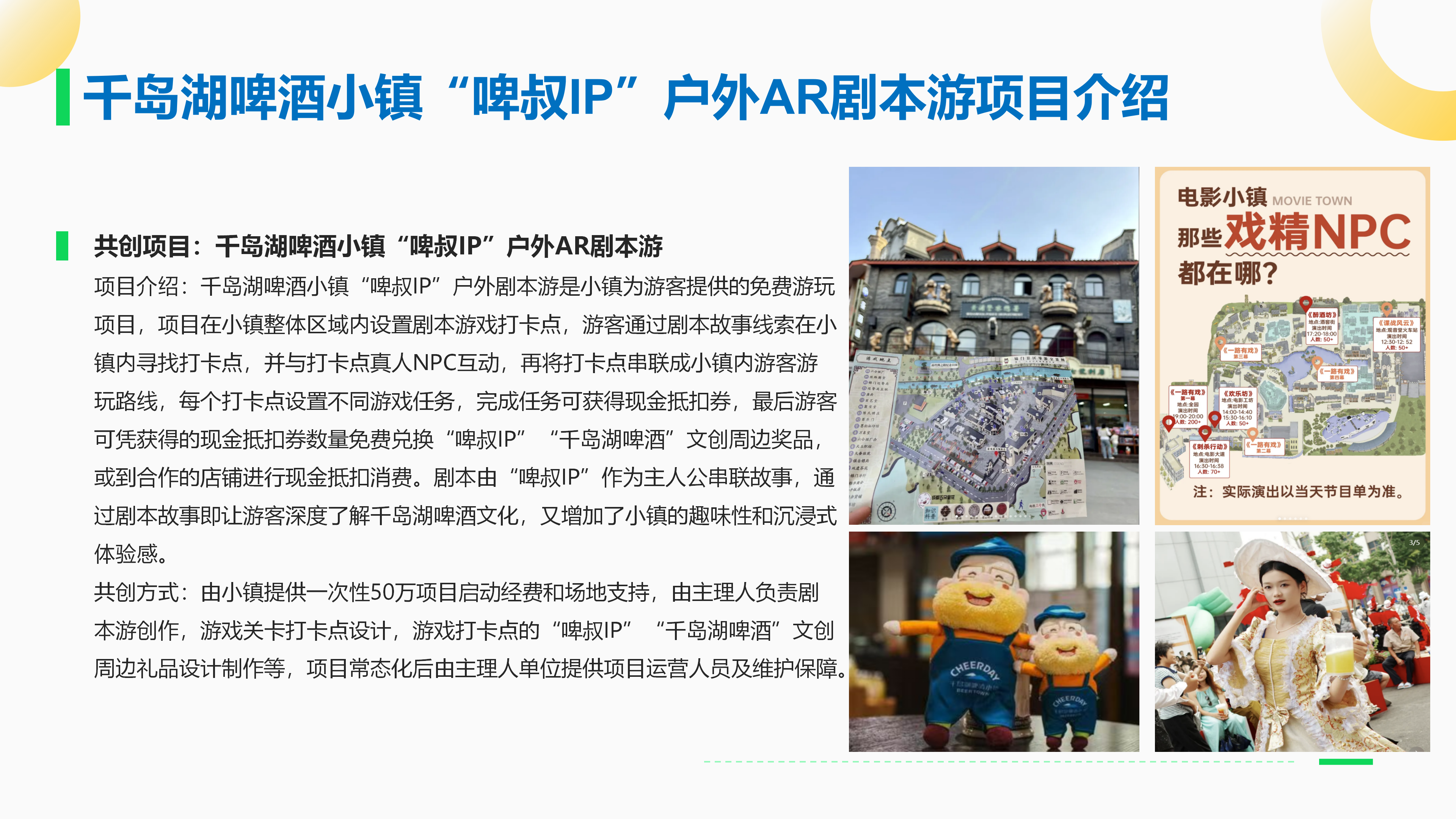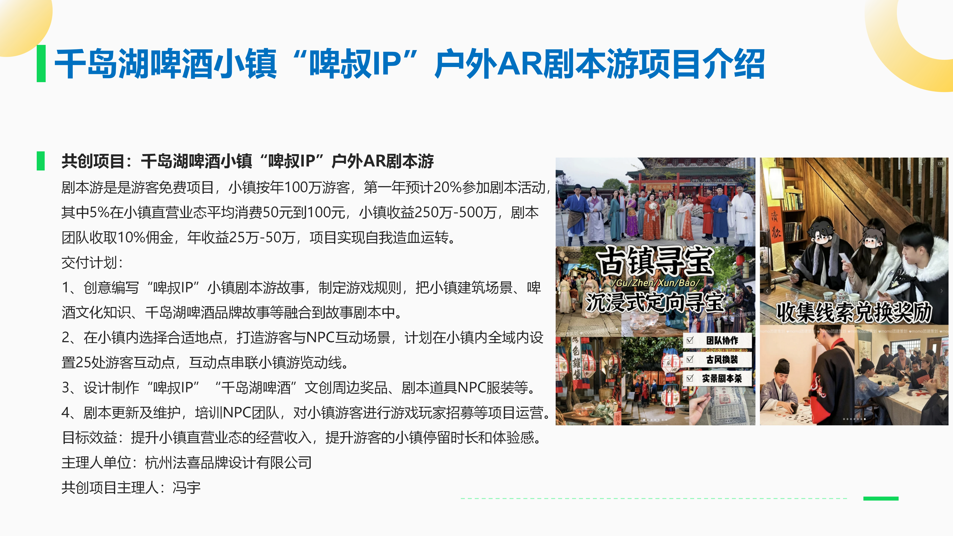 作为小组组长,冯宇带领团队深度参与方案策划与核心创意落地,牵头打造 “啤叔 IP 户外剧本游” 重点共创项目,将 IP 运营、沉浸式体验、商业转化闭环融为一体,成为方案最大亮点之一。该项目以 “啤叔” 为主角,构建全域 25 处互动打卡点,通过 NPC 任务、线索解谜、文化科普、消费抵扣,让游客在游玩中深度感知千岛湖啤酒文化,有效延长停留时长、提升二次消费,助力小镇实现常态化引流与自我造血运营。